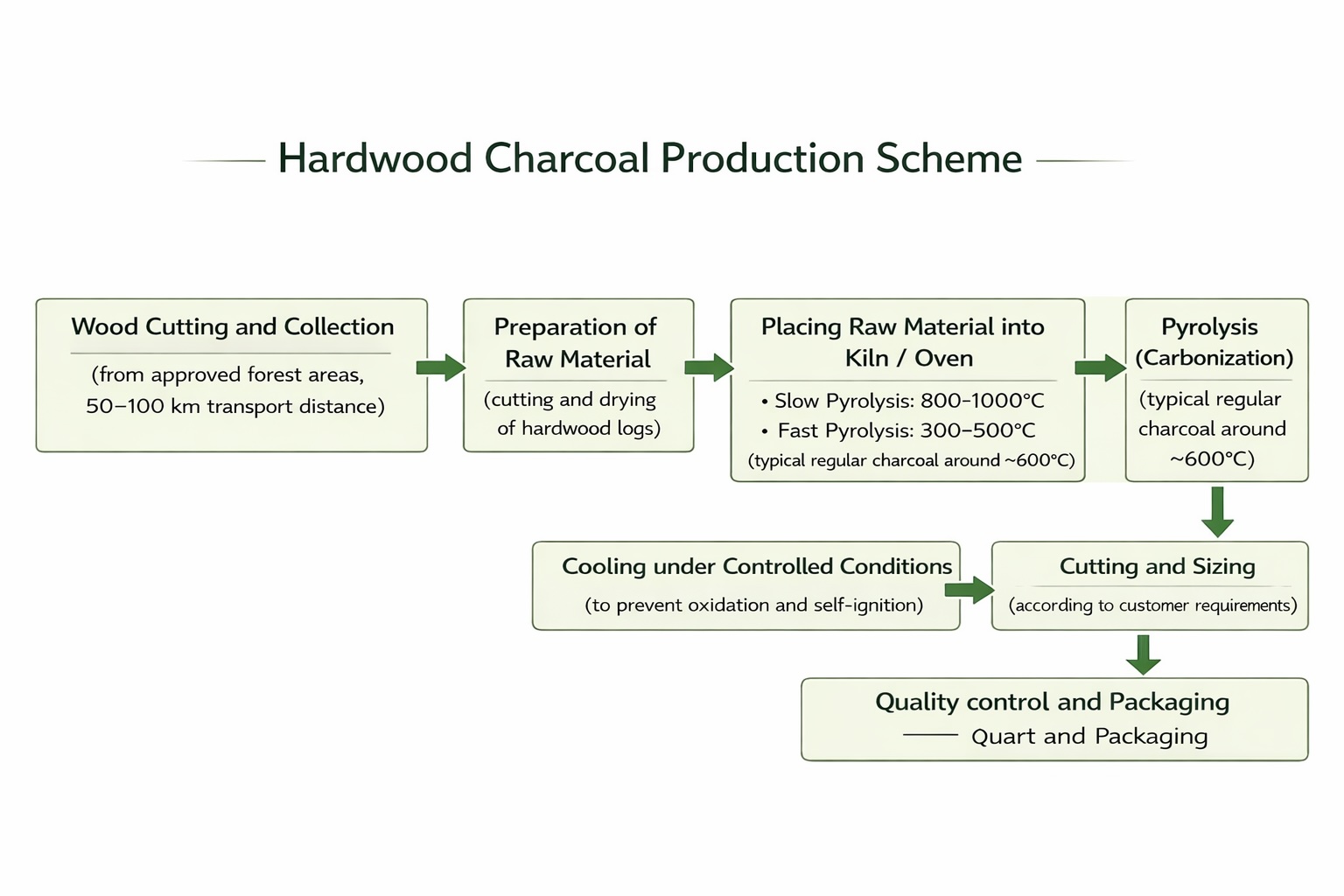 Hardwood charcoal is produced through carbonization (pyrolysis) — the thermal decomposition of wood in a low-oxygen environment. Depending on the technology used, operating temperatures, and the required quality of the final product, the full production cycle may last from 6–12 hours to several days. In rural areas, traditional earth or brick kilns are still widely used. Wood is stacked inside the kiln, ignited, and then carefully sealed to restrict oxygen supply, allowing the material to slowly transform into charcoal rather than burn completely. Temperatures typically rise to 400–500 °C, ensuring effective carbonization.